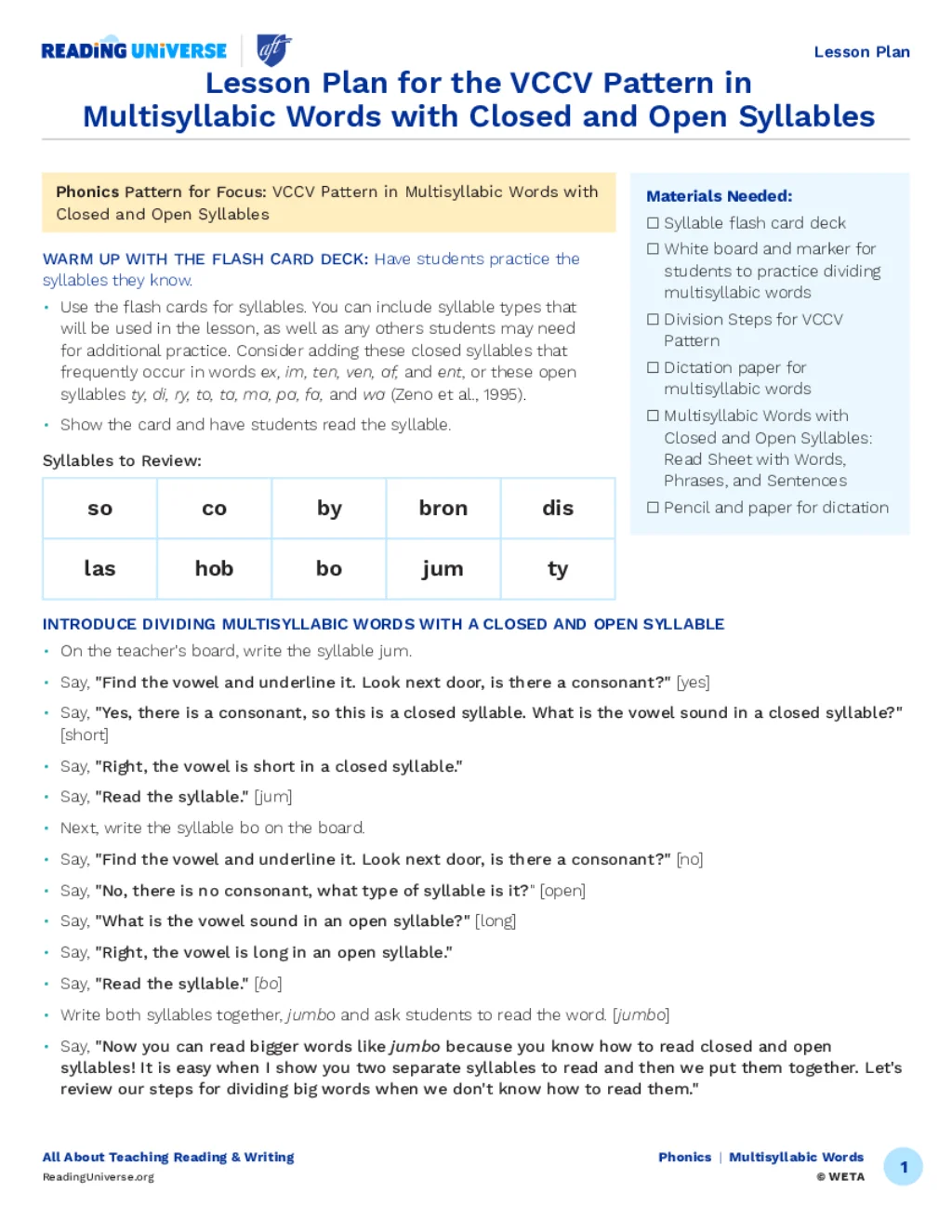 Lesson Plan for the VCCV Pattern in Multisyllabic Words with Closed and Open Syllables