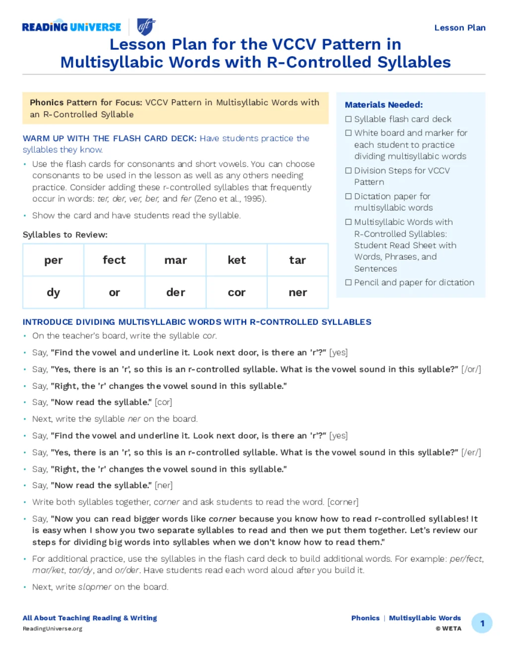 Lesson Plan for the VCCV Pattern in Multisyllabic Words with R-Controlled Syllables