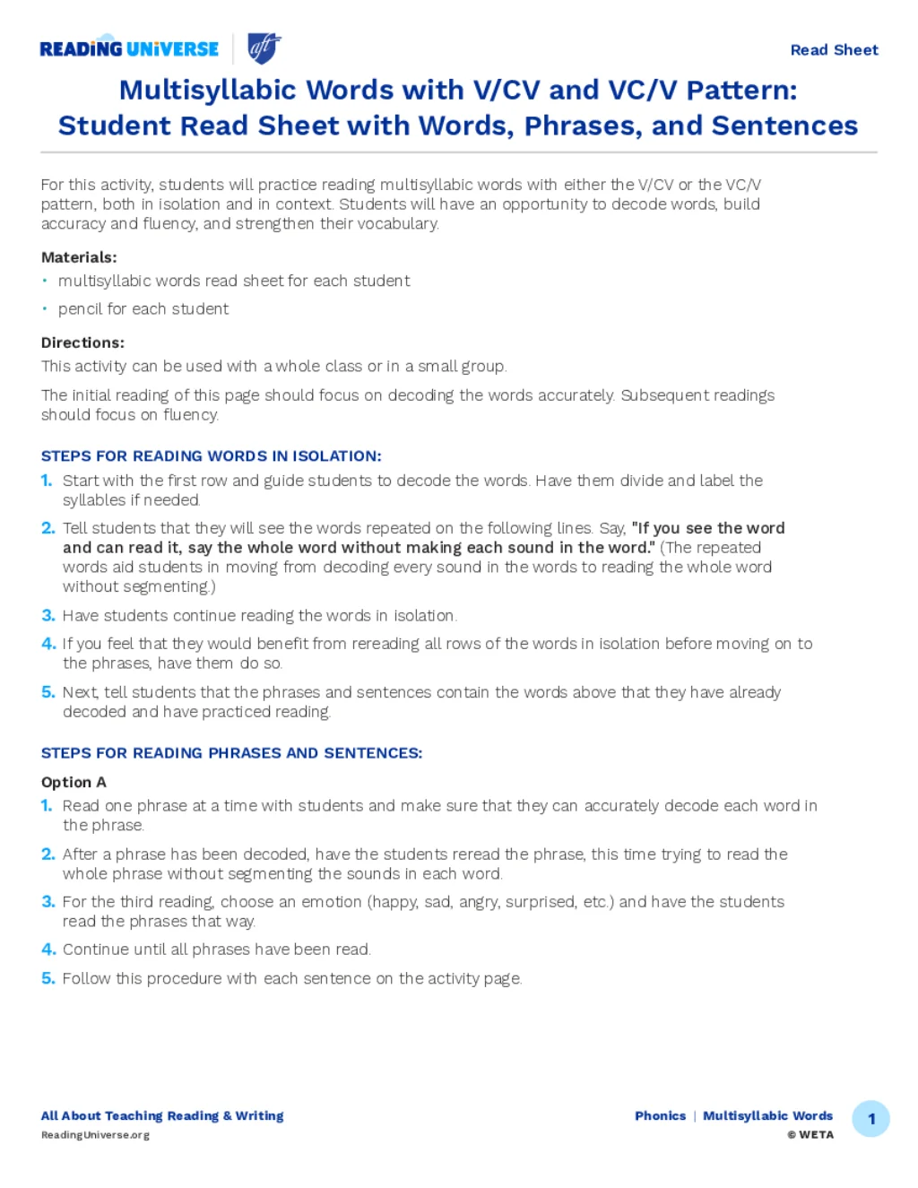 Multisyllabic Words with V/CV and VC/V Pattern: Student Read Sheet with Words, Phrases, and Sentences