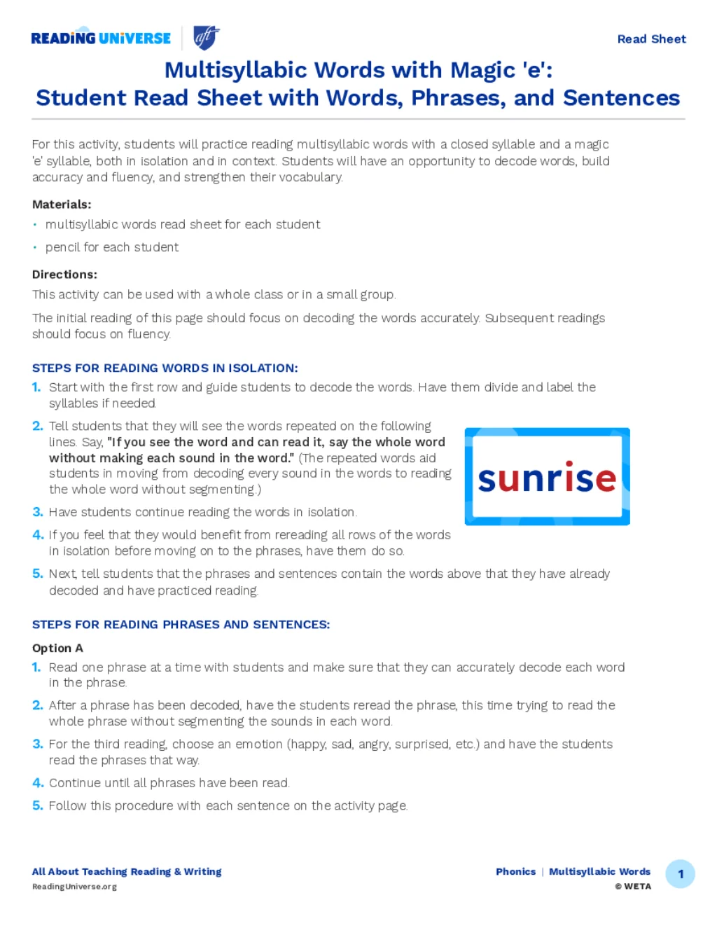 Multisyllabic Words with Magic ‘e’: Student Read Sheet with Words, Phrases, and Sentences