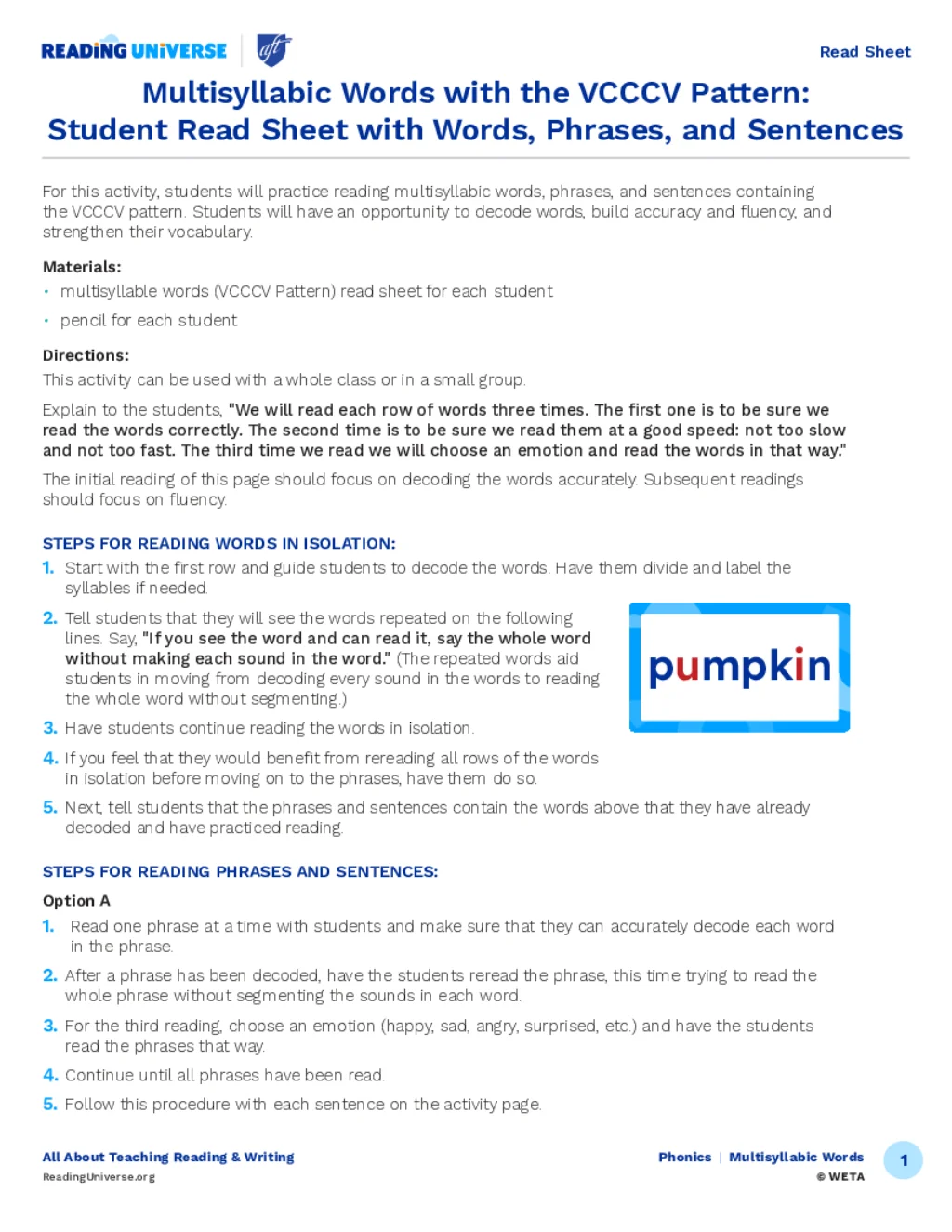Multisyllabic Words with the VCCCV Pattern: Student Read Sheet with Words, Phrases, and Sentences