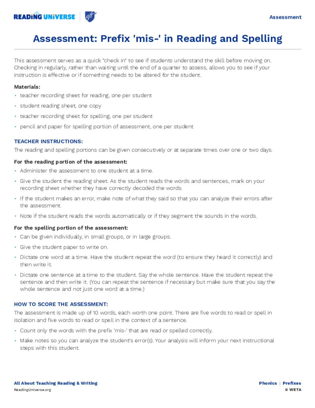 Use this assessment to see where your students’ skills are when it comes to reading and spelling with words that have the prefix 'mis-'.
