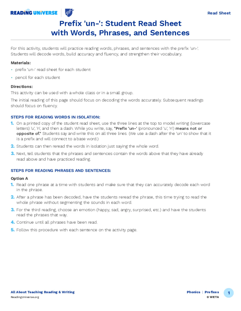 Prefix 'un-': Student Read Sheet with Words, Phrases and Sentences