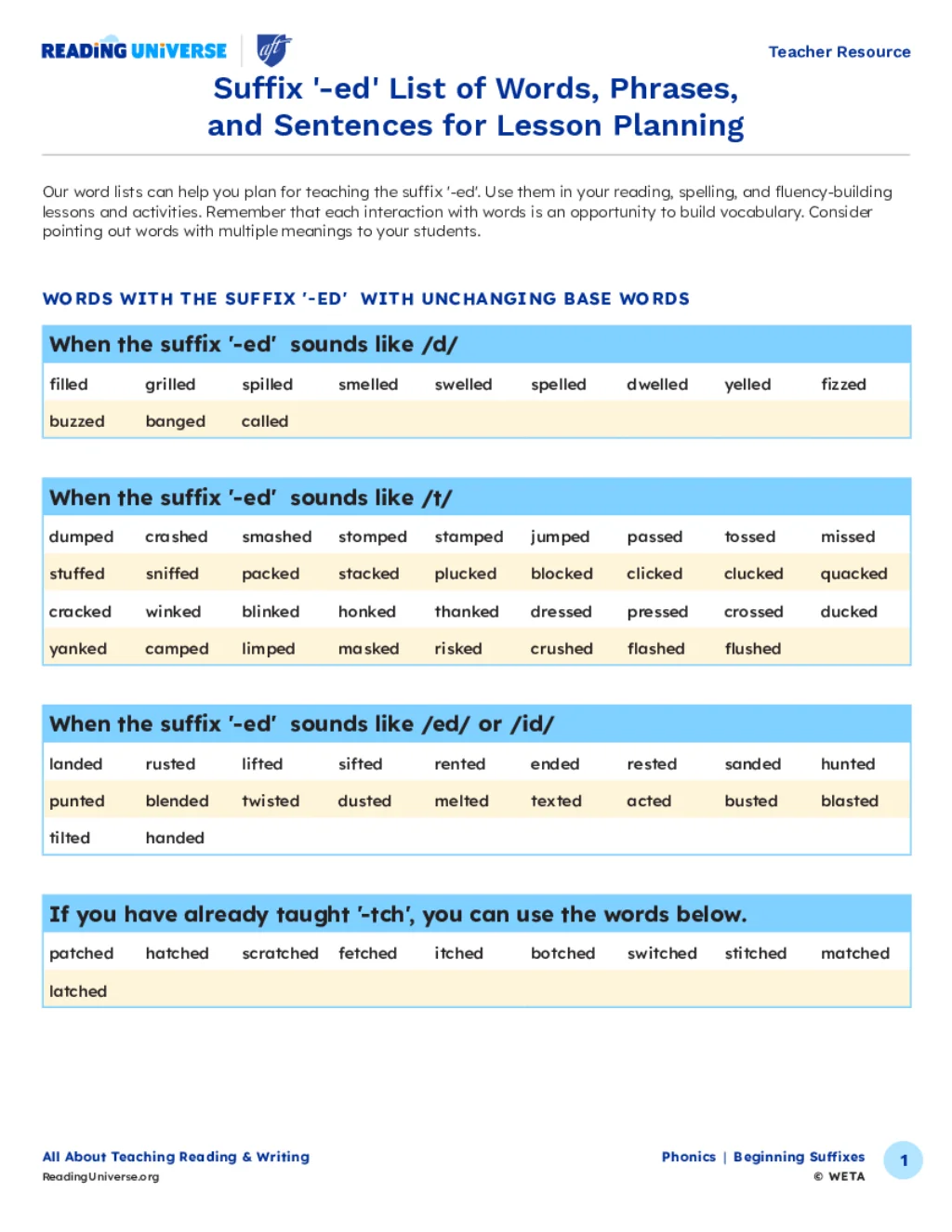 Our word lists can help you plan for teaching the suffix '-ed' . Use them in your reading, spelling, and fluency lessons and activities.