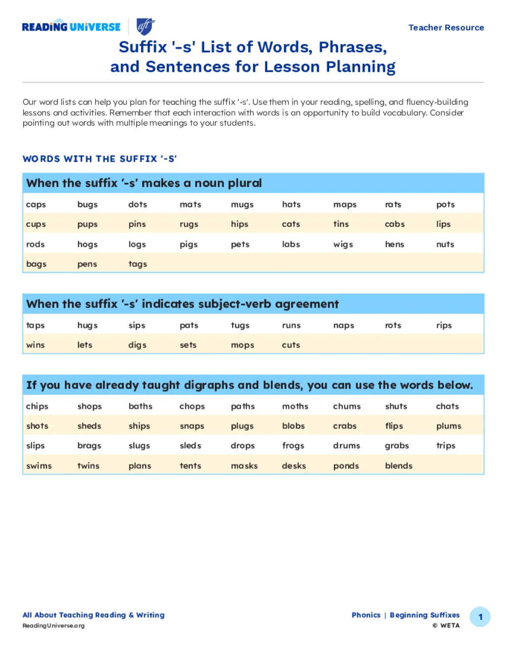 Our word lists can help you plan for teaching the the suffix '-s'. Use them in your reading, spelling, and fluency lessons and activities.