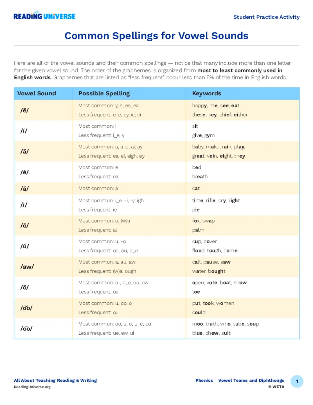 Here are all of the vowel phonemes and their common spellings to help teachers see the graphemes that can represent vowel phonemes.