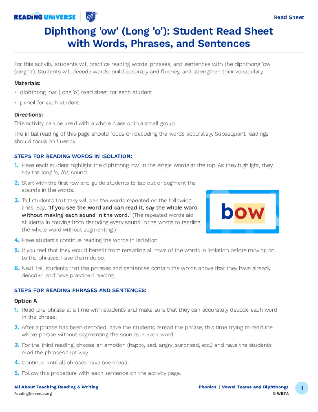 Diphthong 'ow' (Long 'o'): Student Read Sheet with Words, Phrases, and Sentences