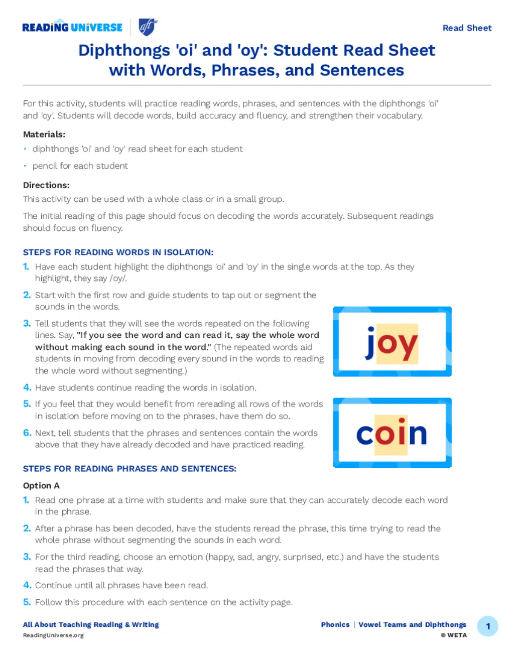 Diphthongs 'oi' and 'oy': Student Read Sheet with Words, Phrases, and Sentences