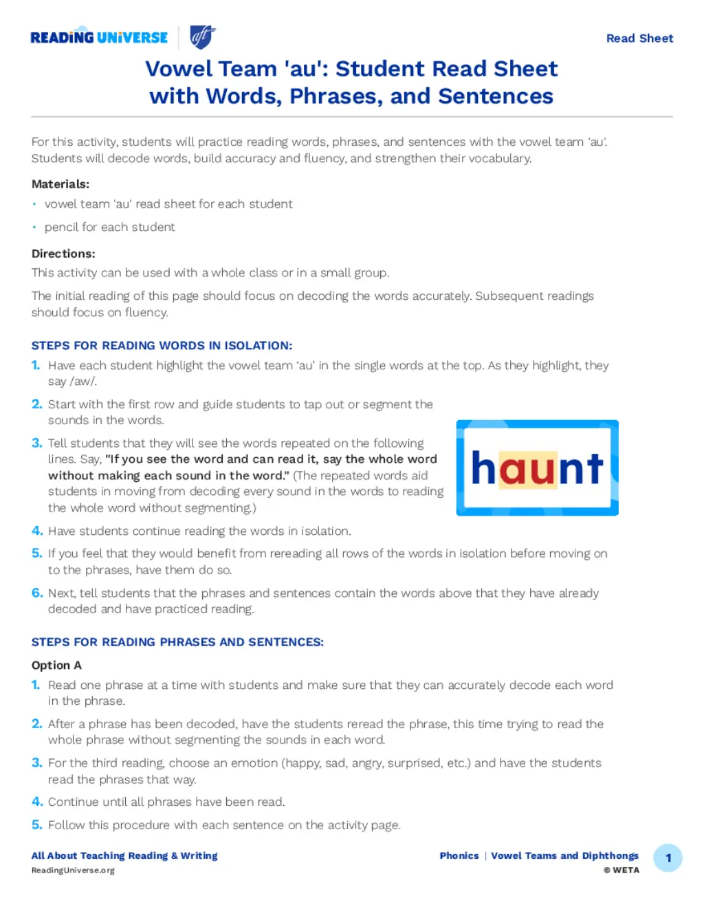 Vowel Team 'au': Read Sheet with Words, Phrases, and Sentences