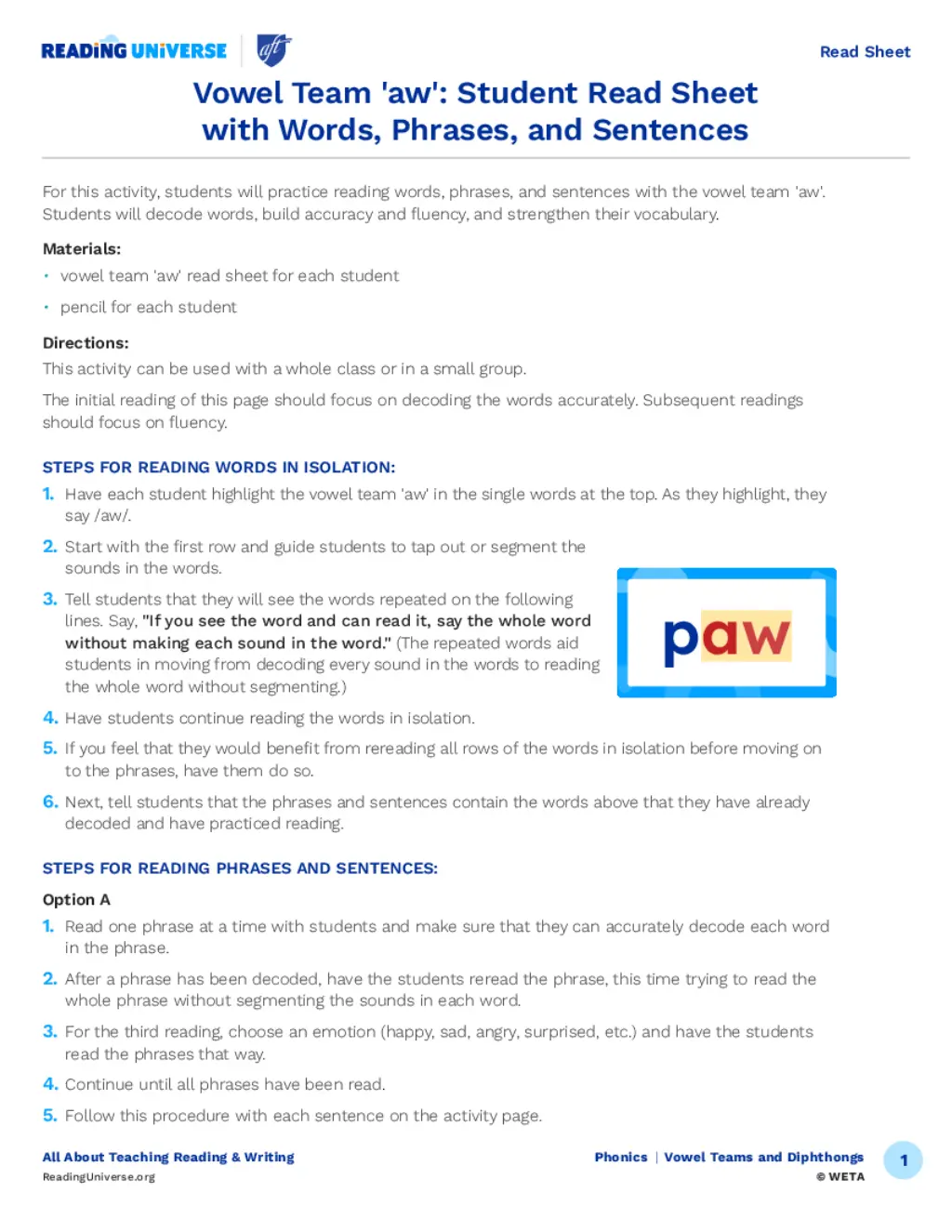 For this activity, students will practice reading words, phrases, and sentences with the vowel team 'ay'. Students will decode words, build accuracy and fluency, and strengthen their vocabulary.