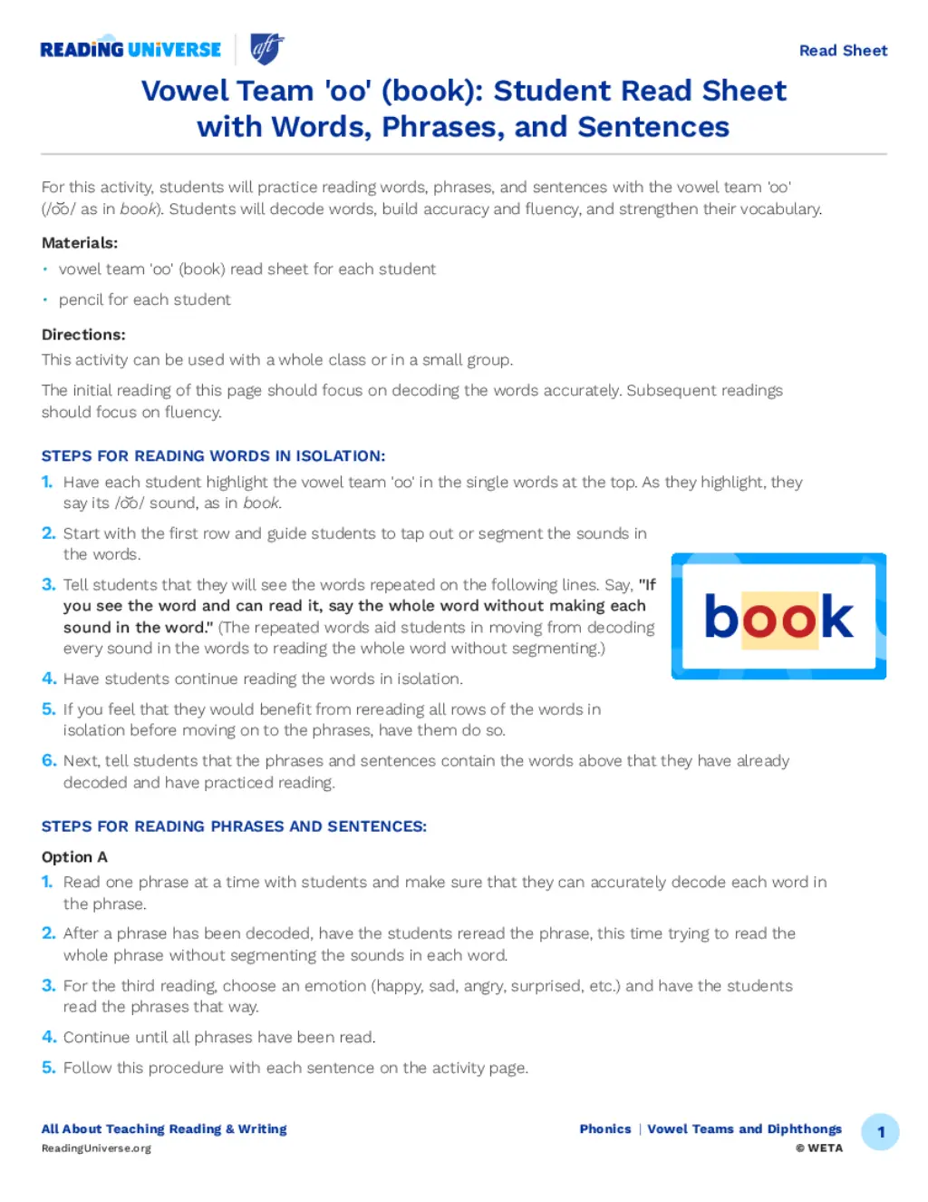 Vowel Team 'oo' ("book"): Student Read Sheet with Words, Phrases, and Sentences