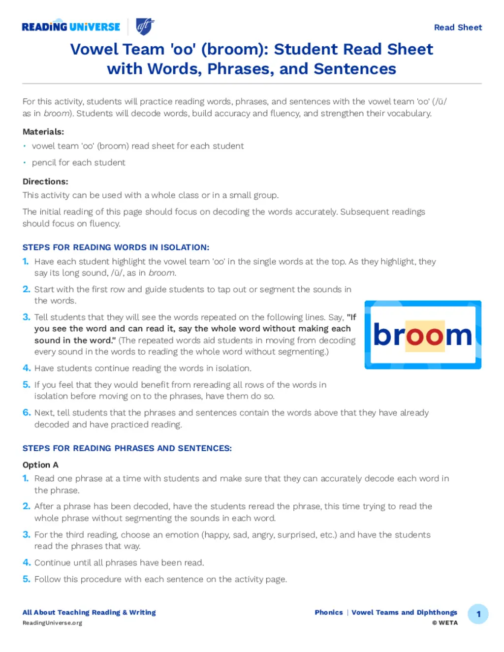 Vowel Team 'oo' ("broom"): Student Read Sheet with Words, Phrases, and Sentences