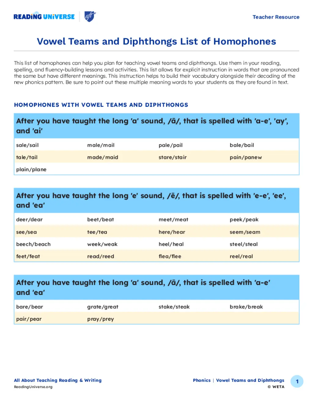This list of homophones can help you plan for teaching vowel teams and diphthongs. Use them in your reading, spelling, and fluency lessons and activities.