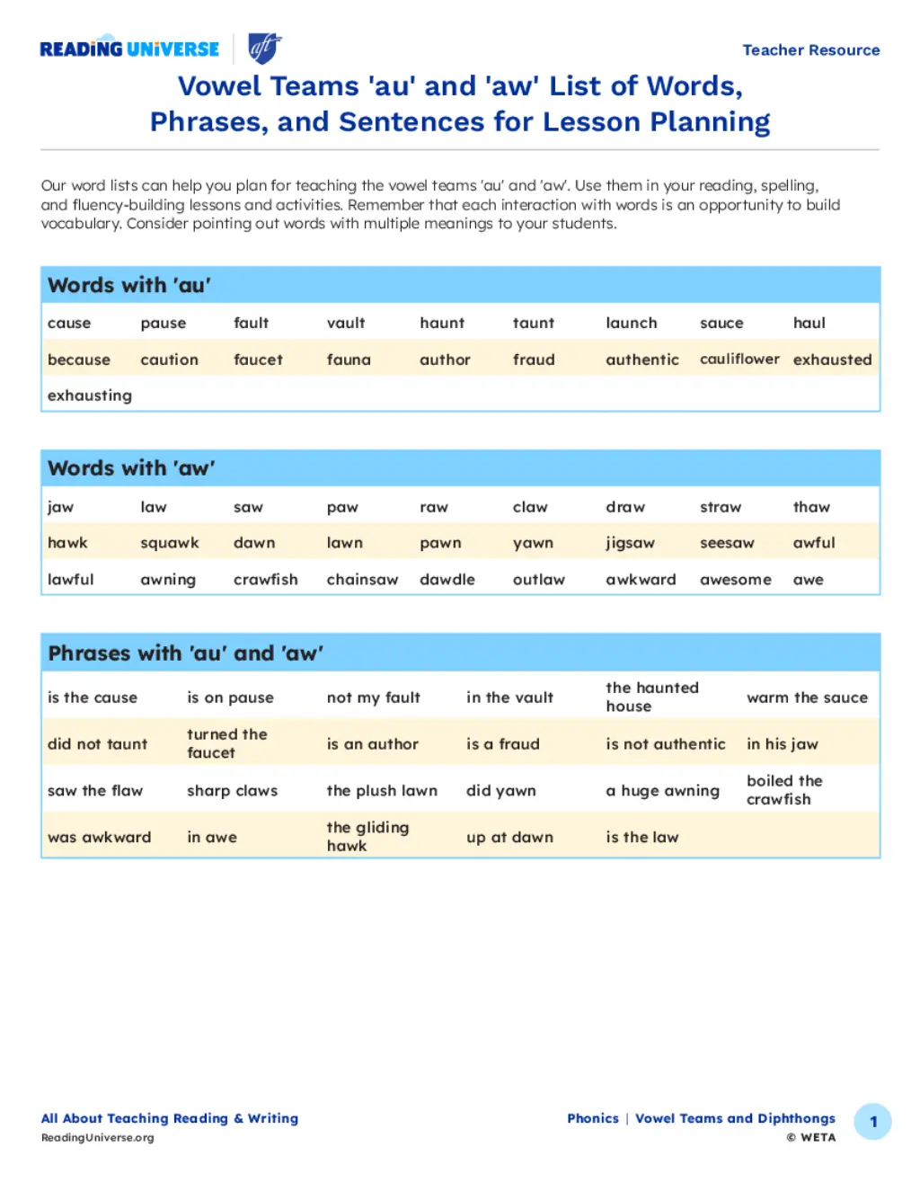 Vowel Teams 'au' and 'aw' List of Words, Phrases, and Sentences for Lesson Planning