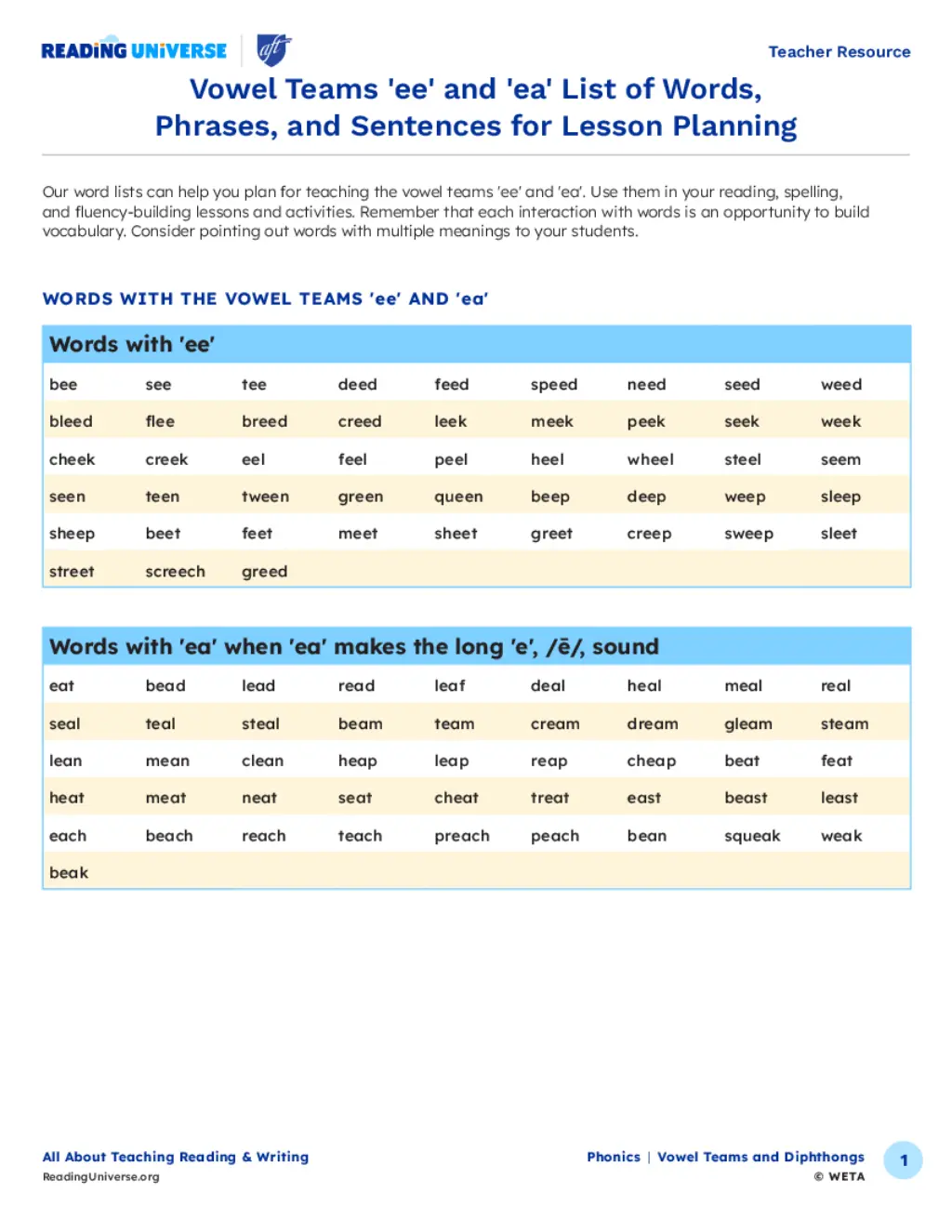 Vowel Teams 'ee' and 'ea' List of Words, Phrases, and Sentences for Lesson Planning