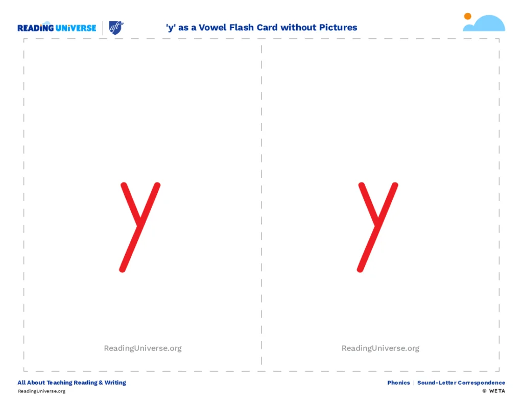 Print this letter flash card without pictures to help students practice the sounds 'y' can make as a vowel.