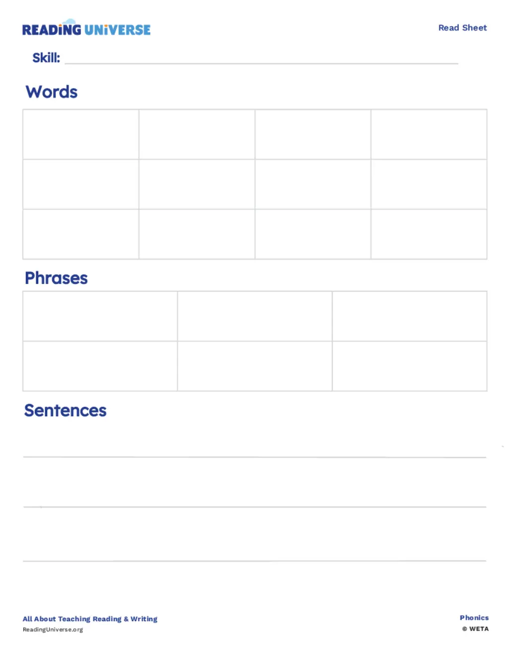 Teachers can create their own read sheet with spaces for words, phrases, and sentences allowing for student practice in decoding words, building accuracy and fluency, and strengthening their vocabulary.