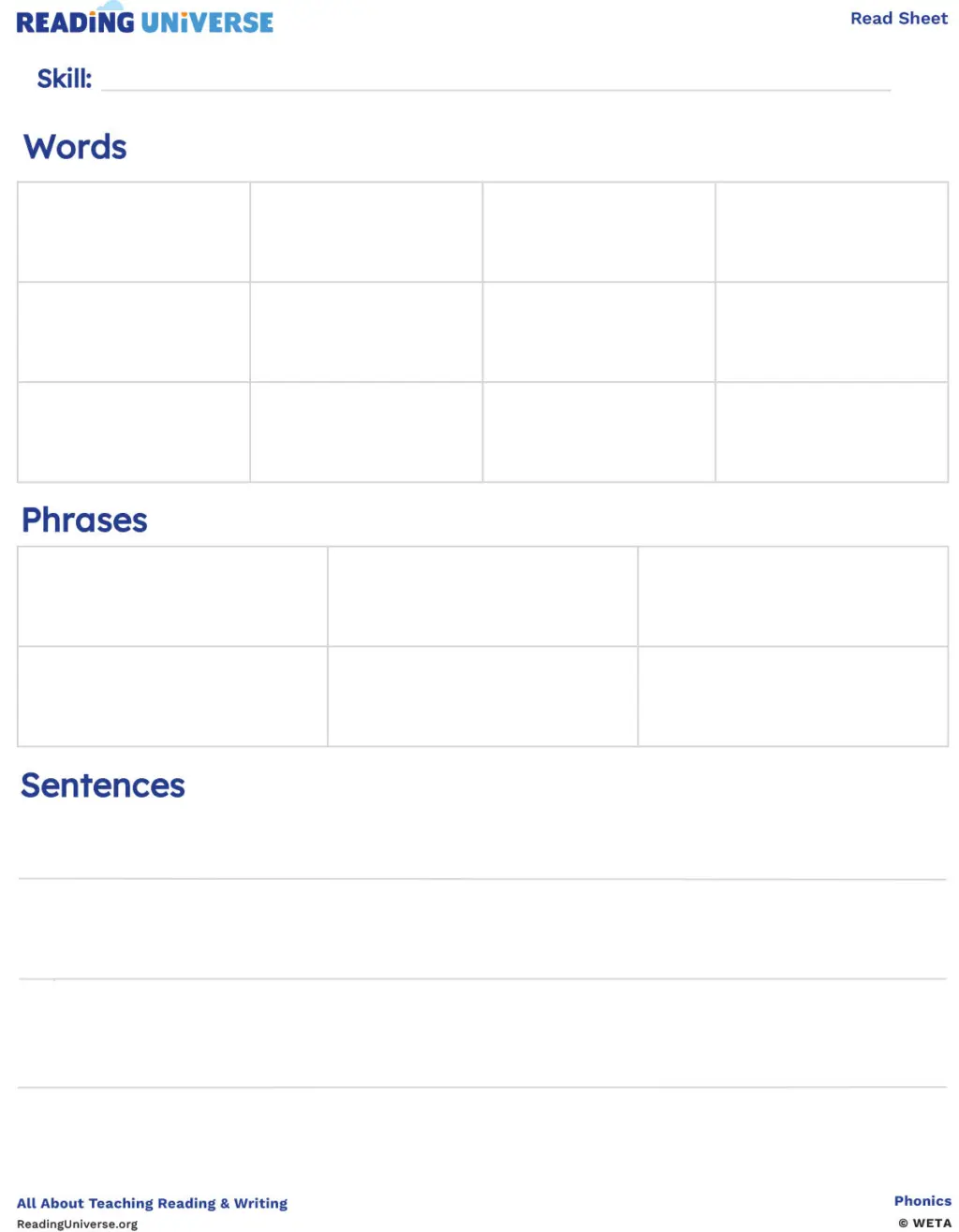 Teachers can create their own read sheet with spaces for words, phrases, and sentences allowing for student practice in decoding words, building accuracy and fluency, and strengthening their vocabulary.