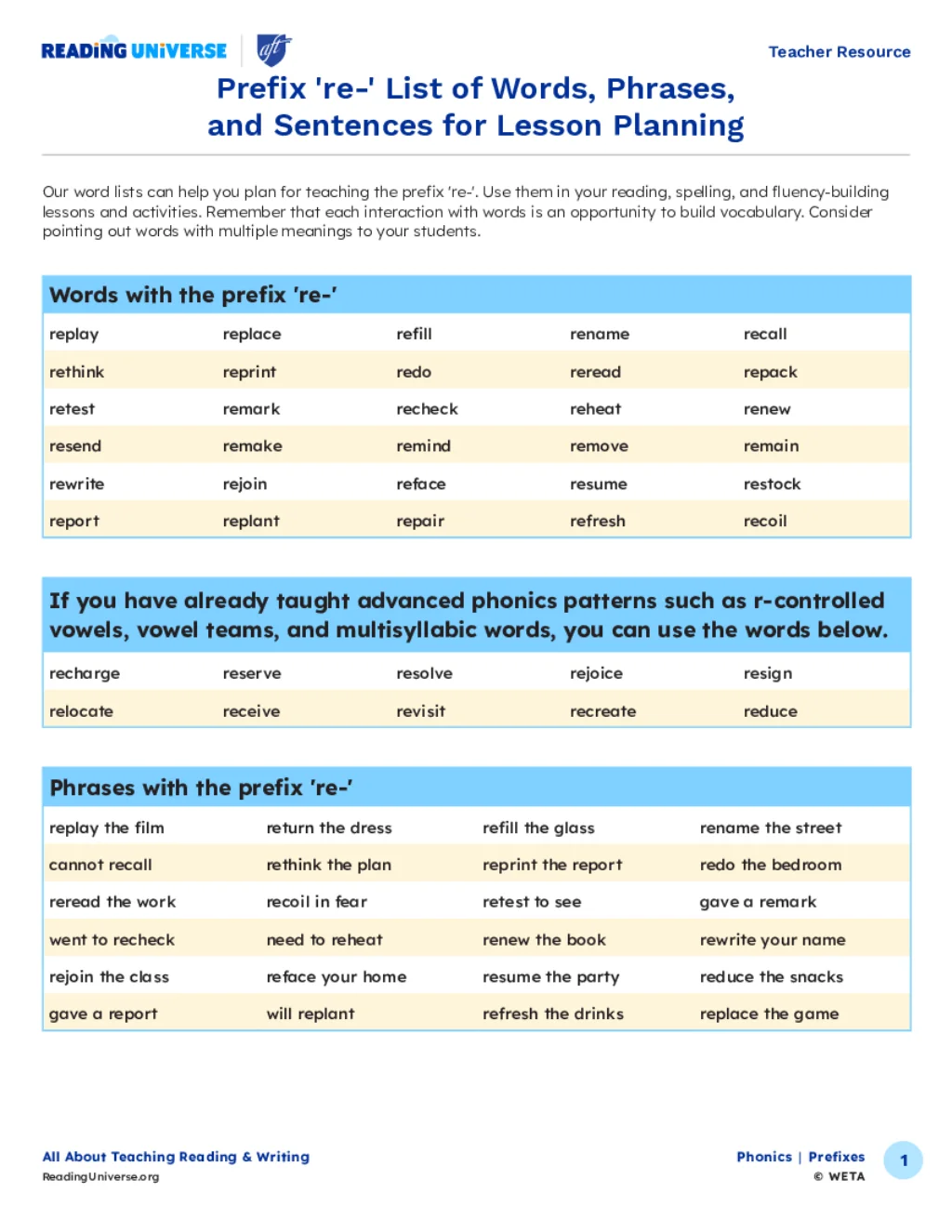 Our word lists can help you plan for teaching the prefix 're-'. Use them in your reading, spelling, and fluency lessons and activities.