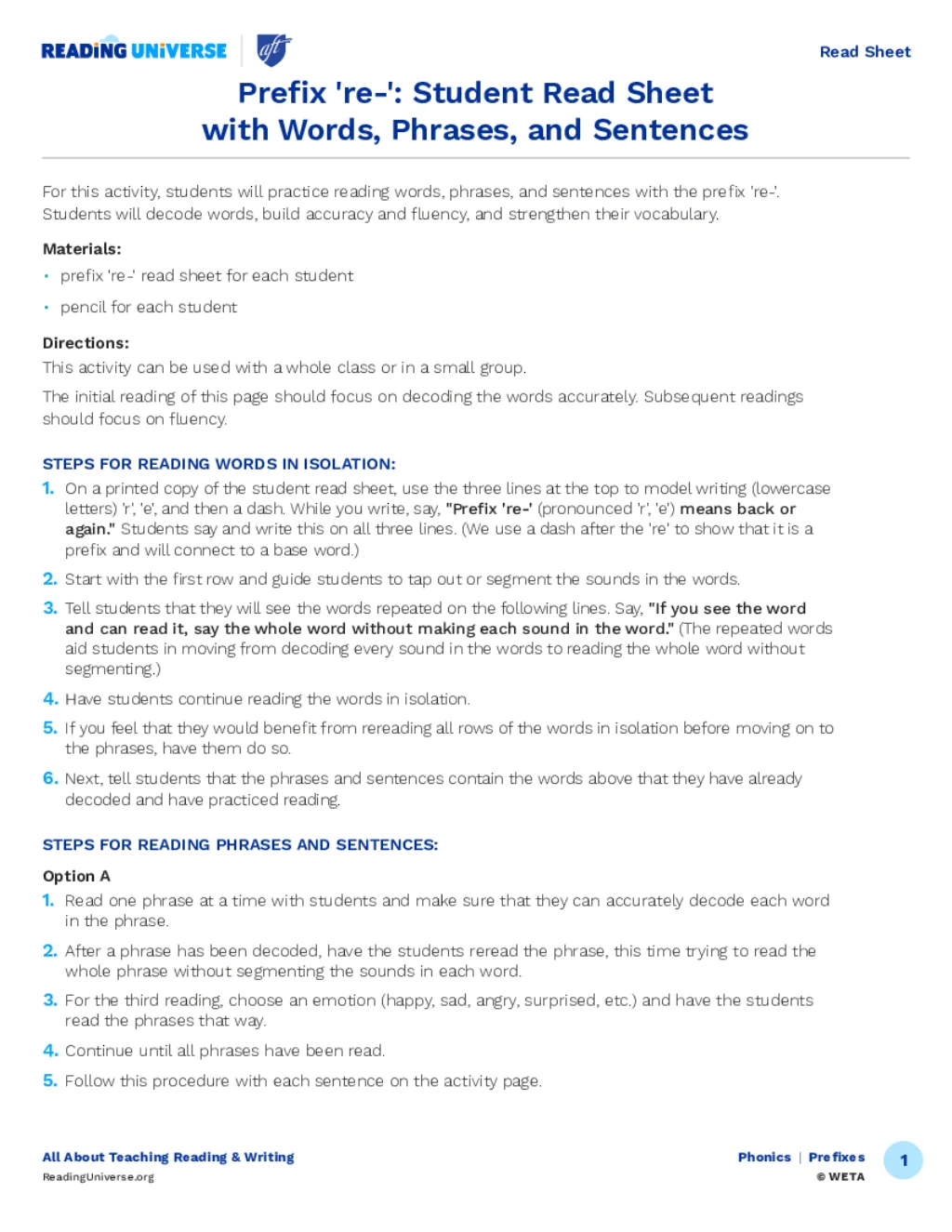 Prefix ‘re-’: Student Read Sheet with Words, Phrases and Sentences