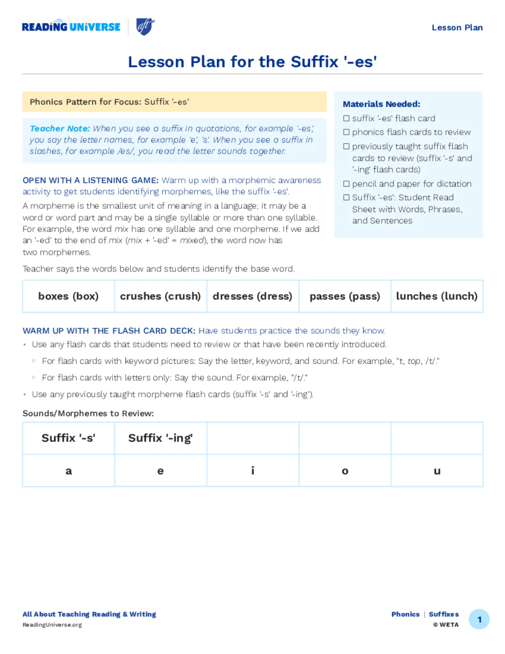 Lesson Plan for the Suffix '-es'