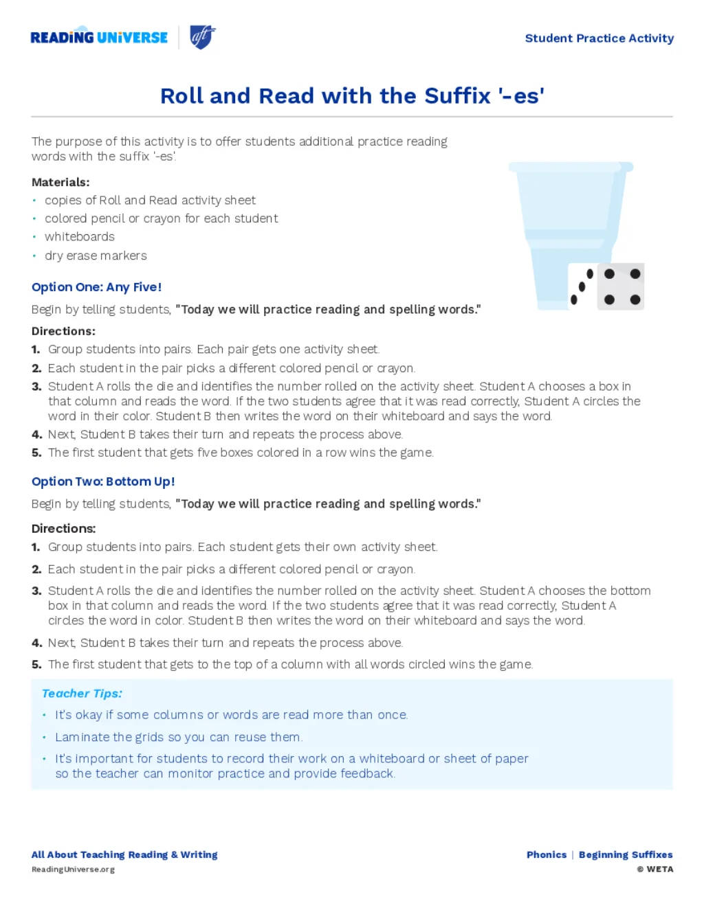 The purpose of this activity is to offer students additional practice reading with the suffix '-es'. Students roll a die and take turns reading and spelling words with the patterns.