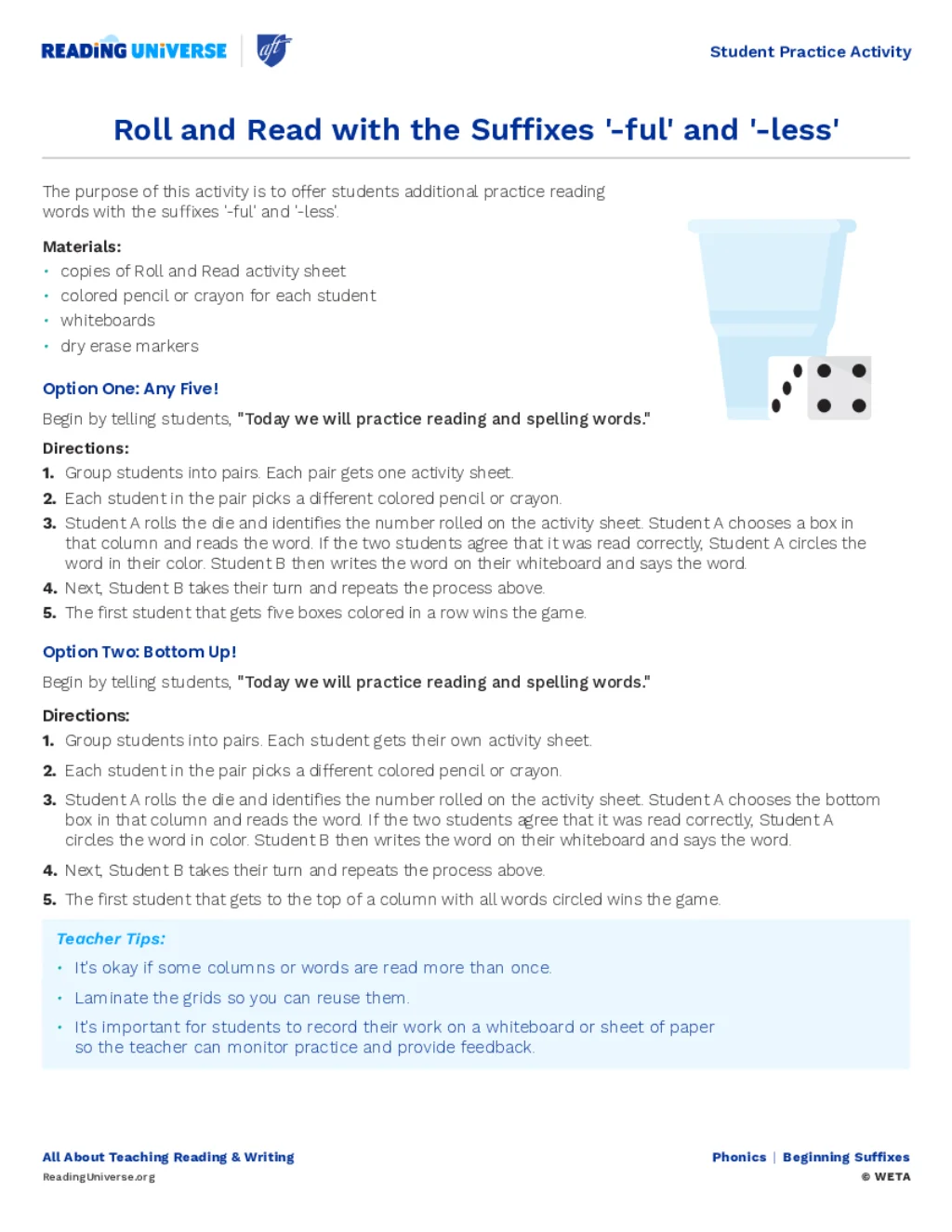 The purpose of this activity is to offer students additional practice reading with the suffix '-ful' and suffix '-less'. Students roll a die and take turns reading and spelling words with the patterns.