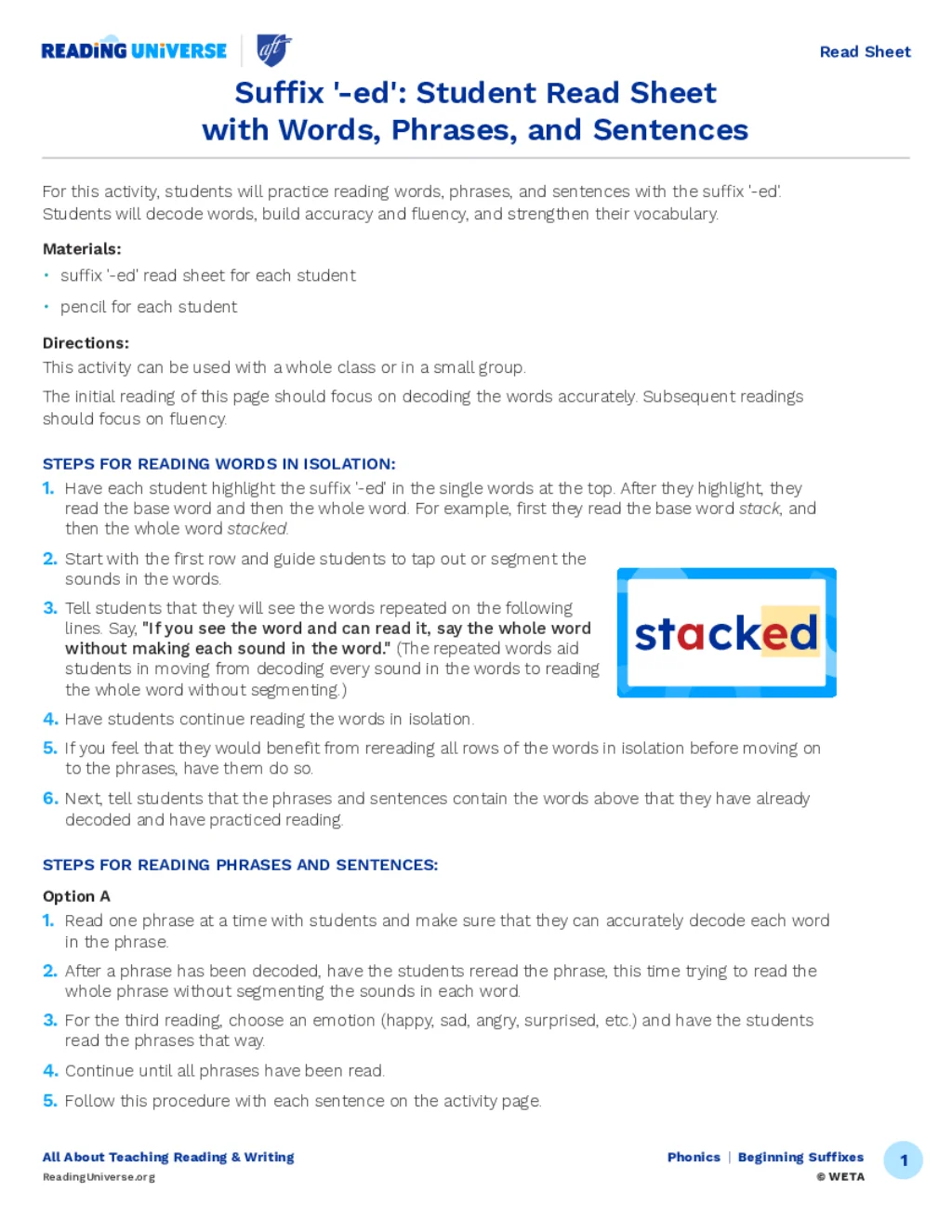 Suffix '-ed': Student Read Sheet with Words, Phrases, and Sentences