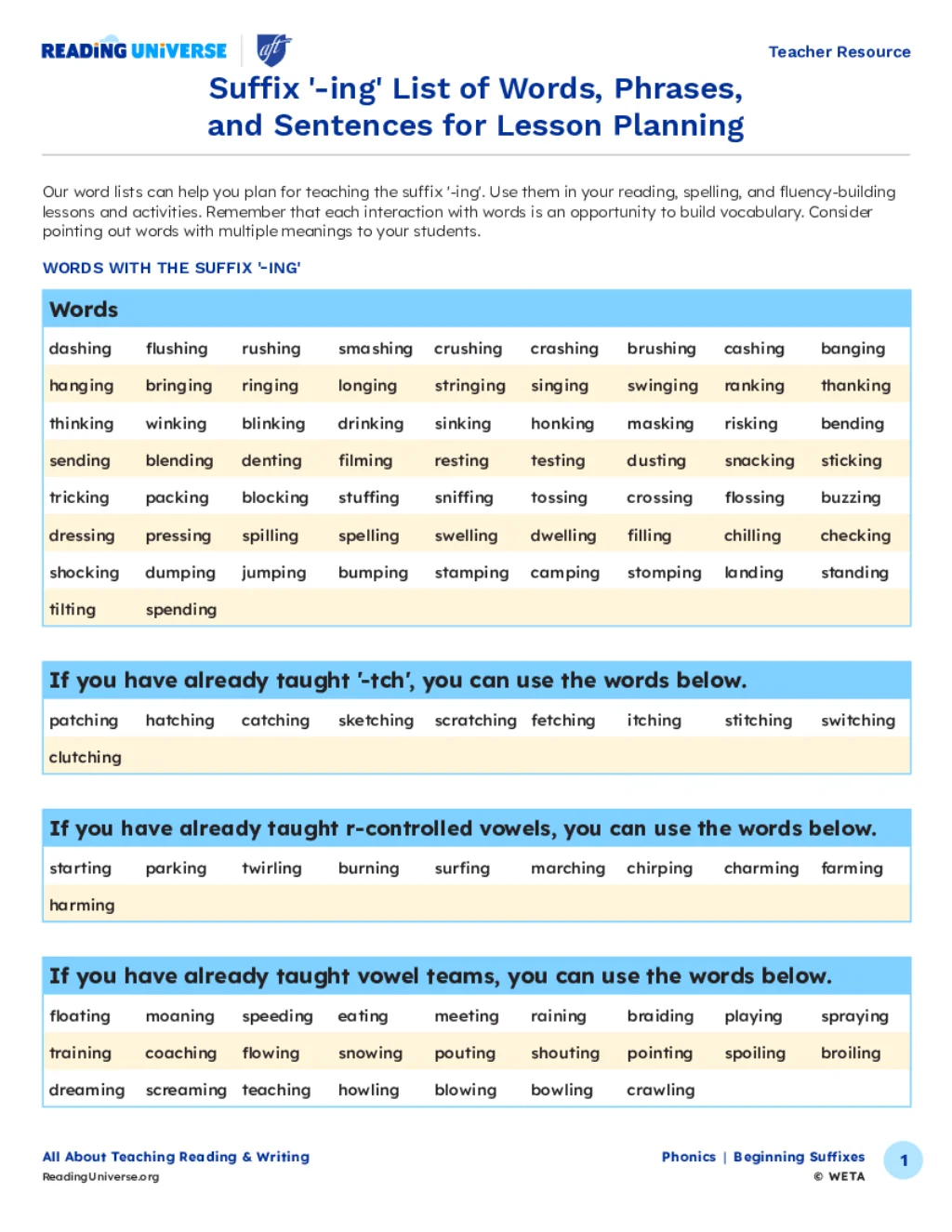 Our word lists can help you plan for teaching the suffix '-ing'. Use them in your reading, spelling, and fluency lessons and activities.