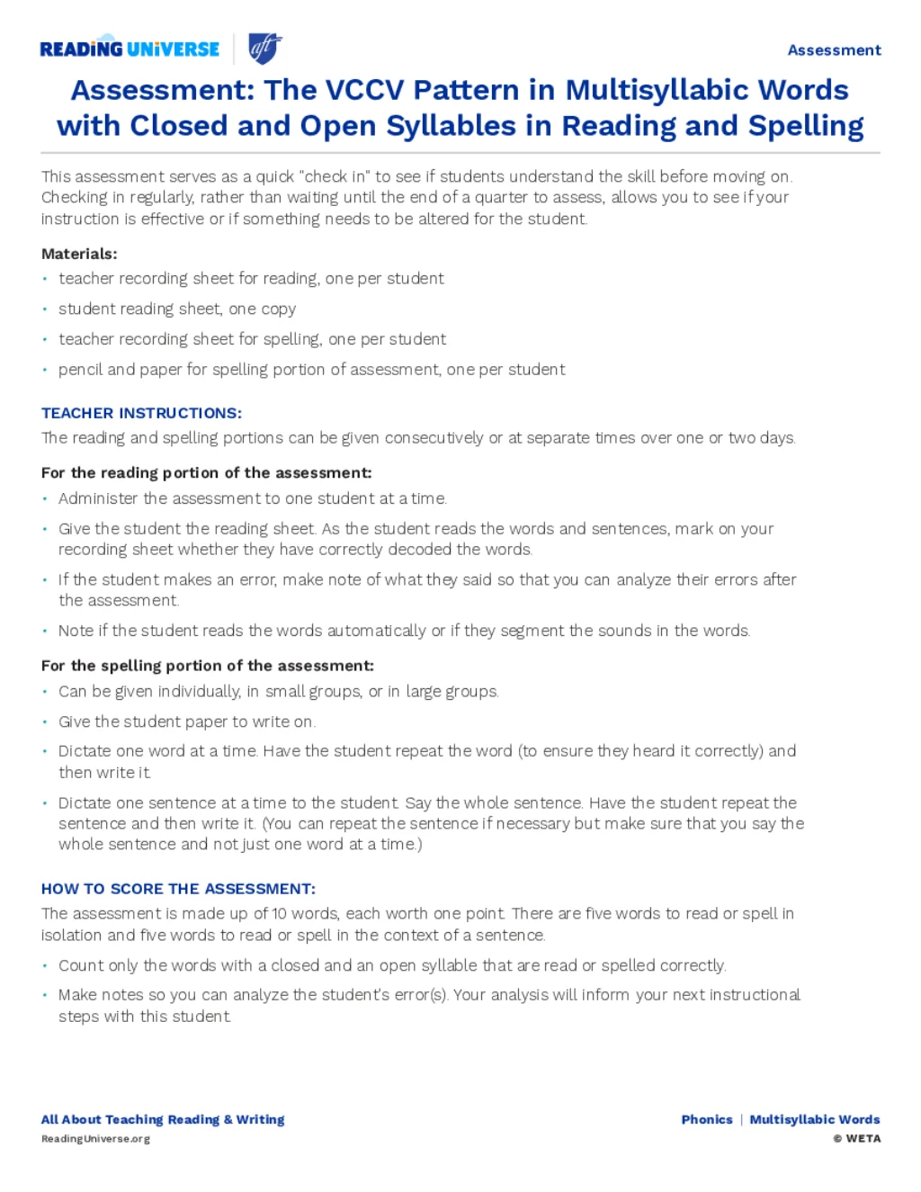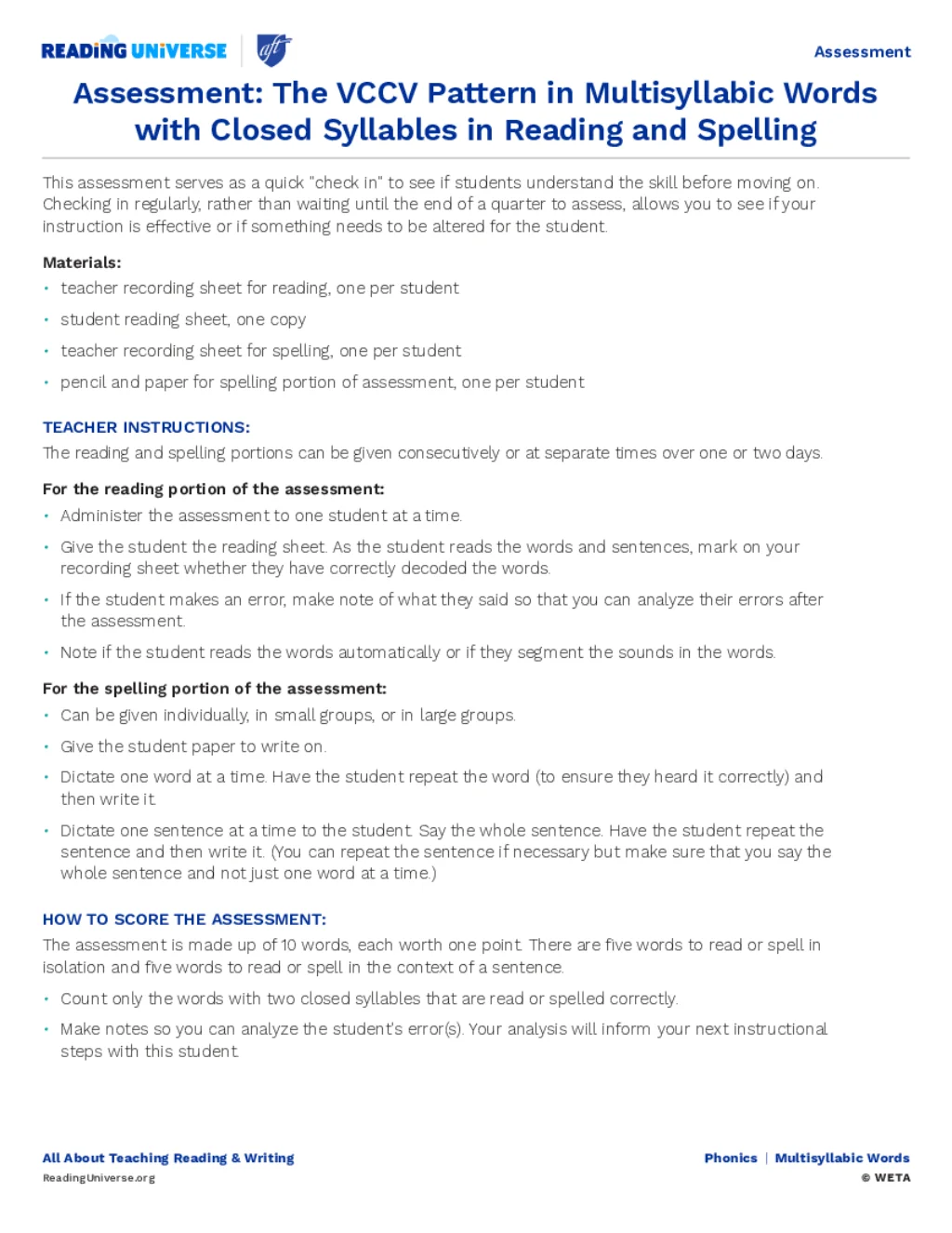 Assessment: The VCCV Pattern in Multisyllabic Words with Closed Syllables in Reading and Spelling