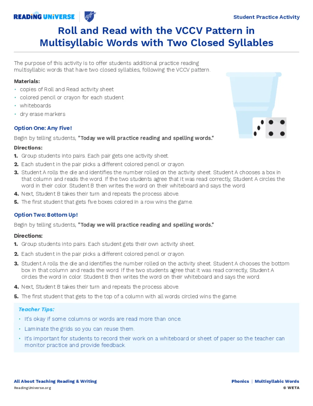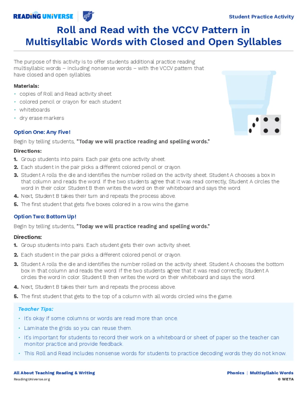 Roll and Read with the VCCV Pattern in Multisyllabic Words with Closed and Open Syllables