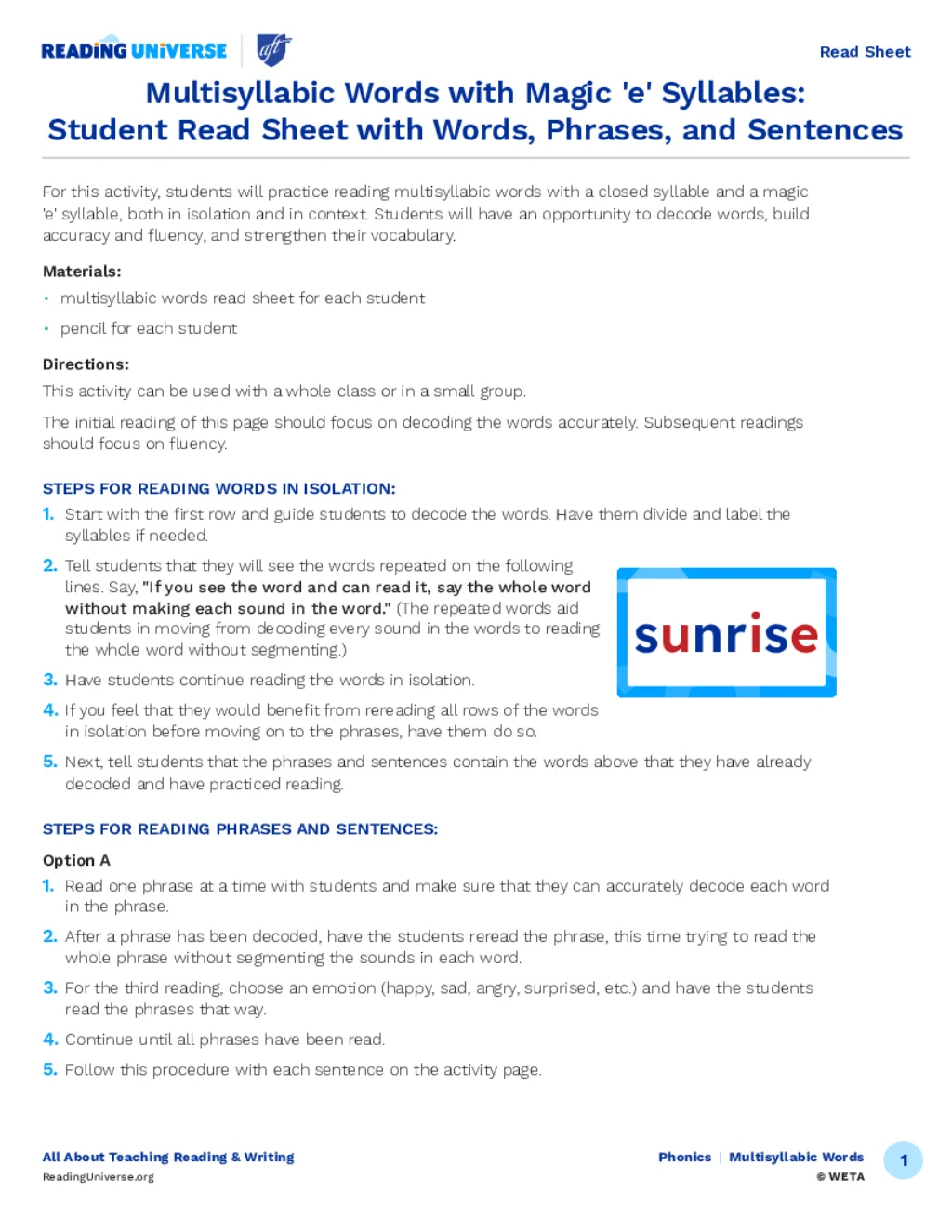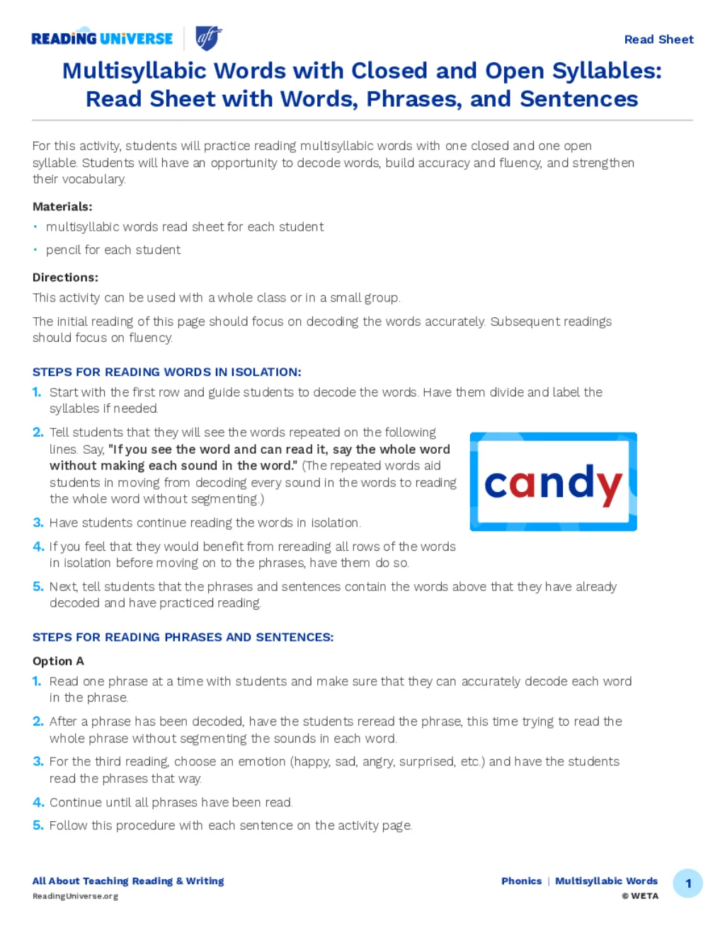 Multisyllabic Words with Closed and Open Syllables: Read Sheet with Words, Phrases, and Sentences