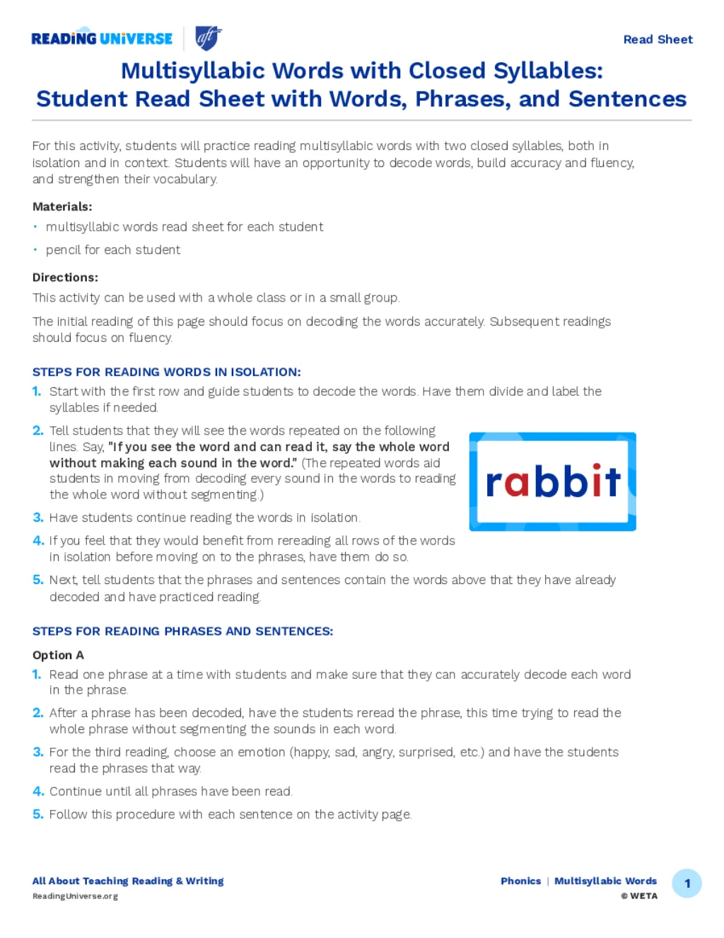 Multisyllabic Words With Closed Syllables: Student Read Sheet with Words, Phrases, and Sentences