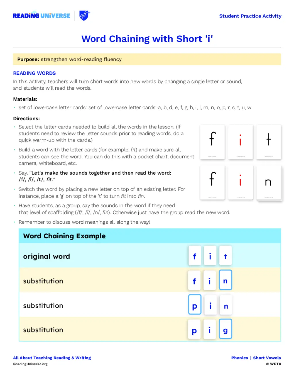 The purpose of this activity is to offer students practice reading words with a short ‘i’, like fit and fin.