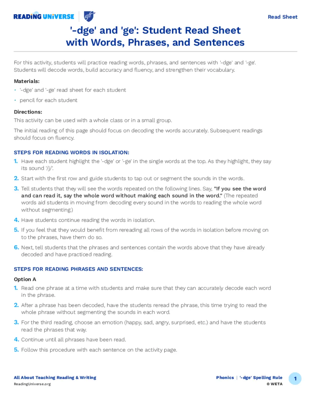 '-dge' and '-ge' Student Read Sheet with Words, Phrases, and Sentences
