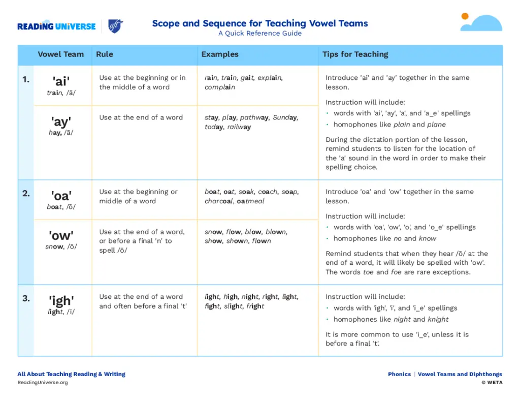 Your understanding as a teacher of all the ways vowel teams can be spelled is important. Check out our scope and sequence (opens in new window) that has a comprehensive list of vowel teams and the sounds they can represent.