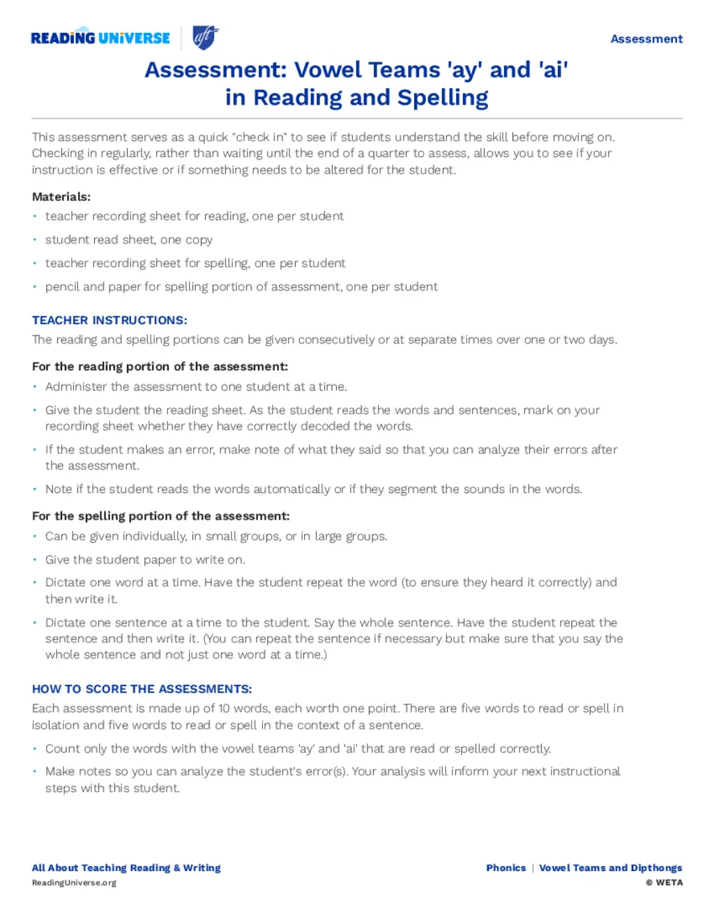 7. Assessments for Vowel Teams and Diphthongs