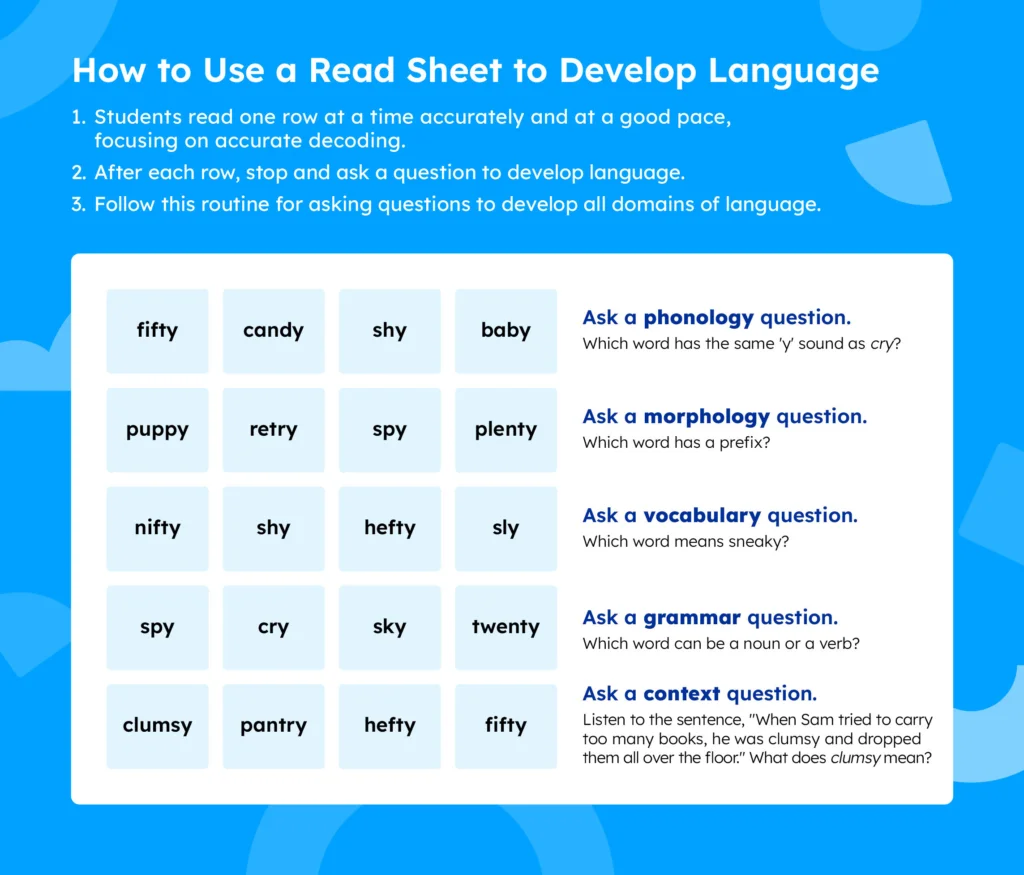 Ms. Delgado: I want you to look at row one. We are going to read the words, and then I will ask you a question after each row. Okay. Ready? Begin.