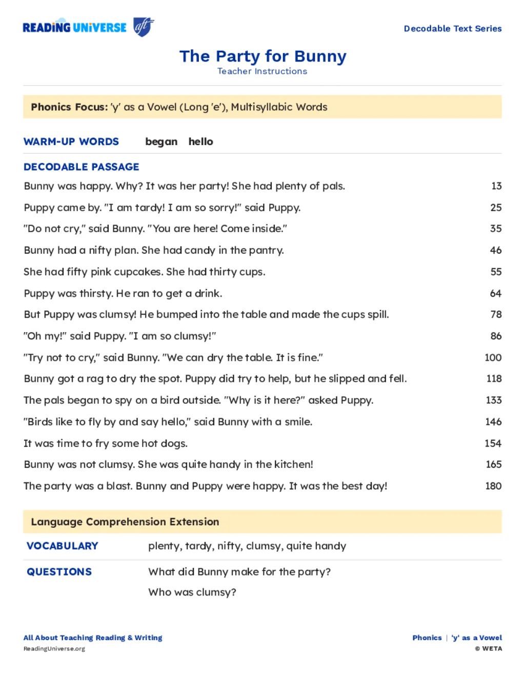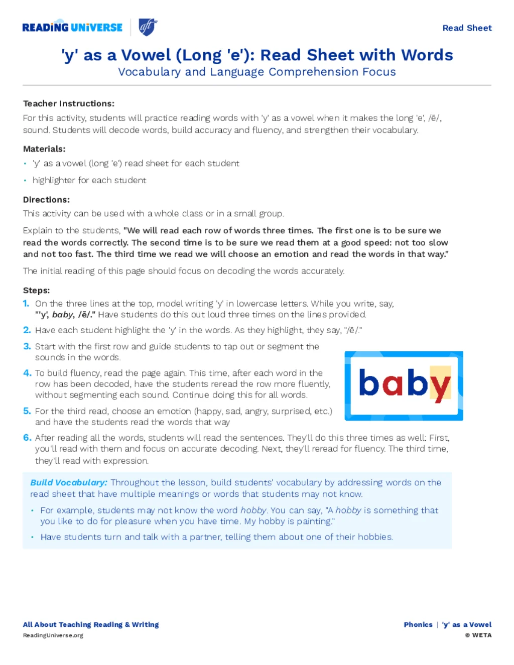 'y' as a Vowel (Long 'e'): Read Sheet with Words