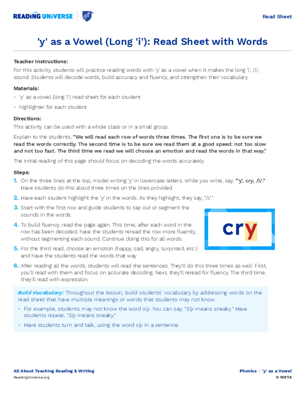 'y' as a Vowel (Long 'i'): Read Sheet with Words