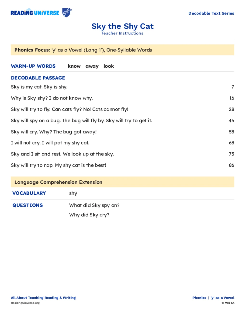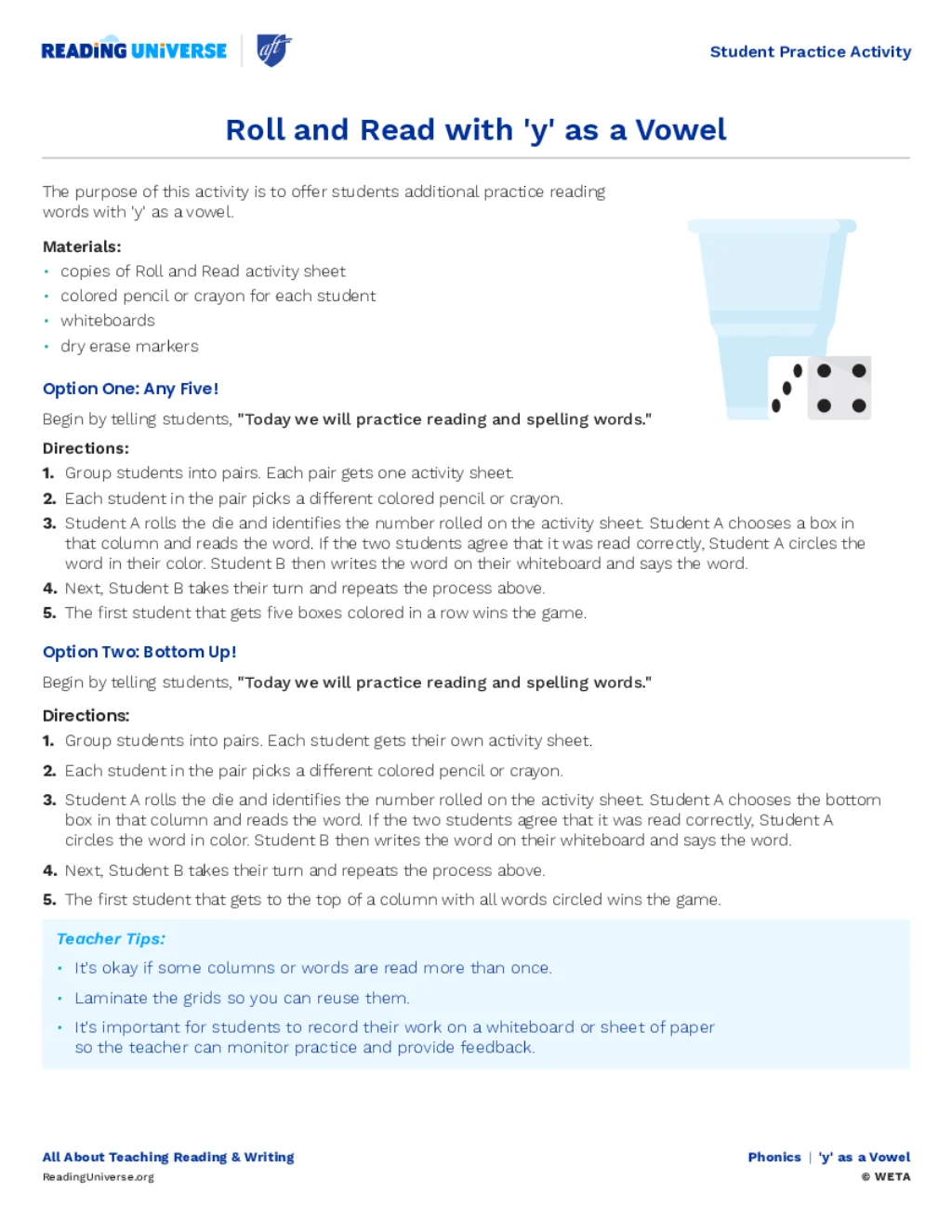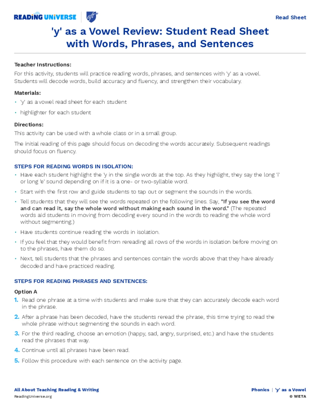 'y' as a Vowel Review: Student Read Sheet with Words, Phrases, and Sentences