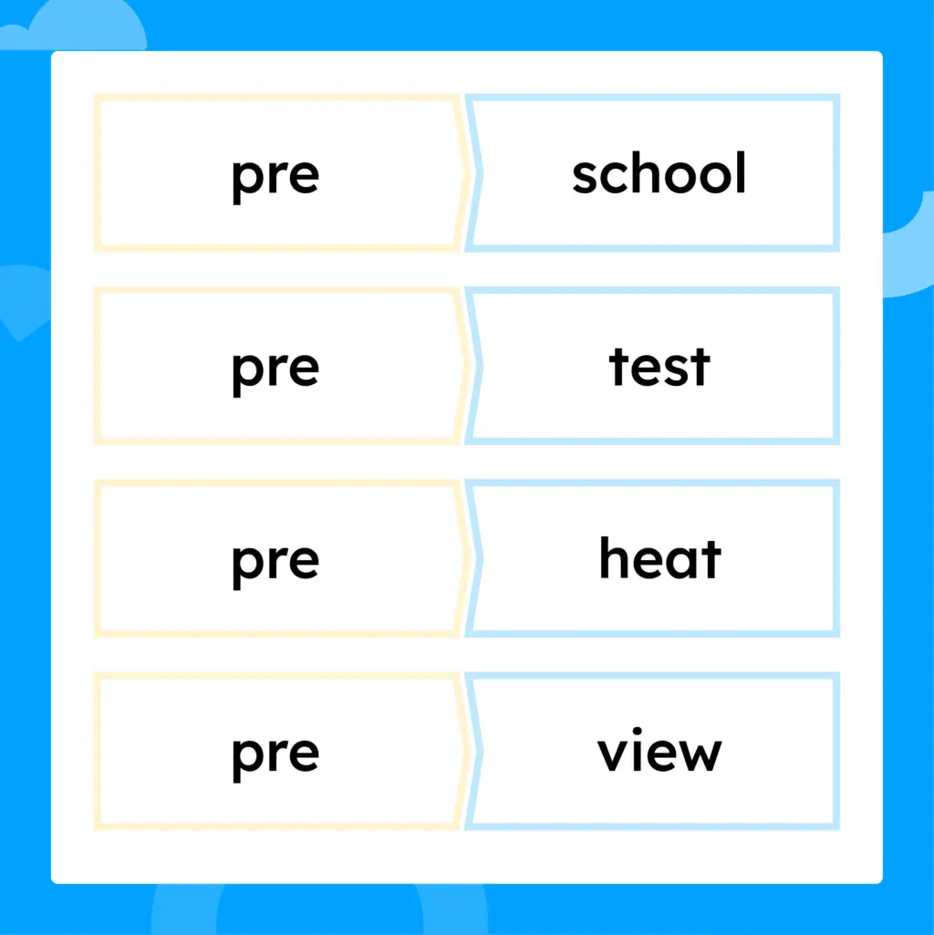 The prefix 'pre-' is a morpheme that means "before" or "in advance." You can add the prefix 'pre-' to nouns to show that something comes before something else: