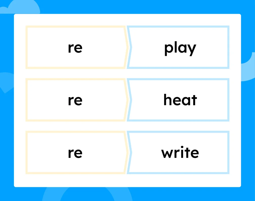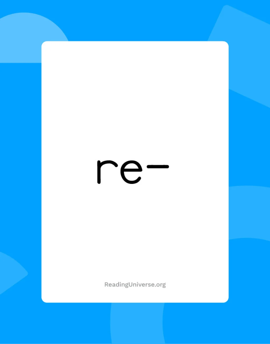 Watch and listen to what we say with this card. The prefix 're-' means "back" or "again."
