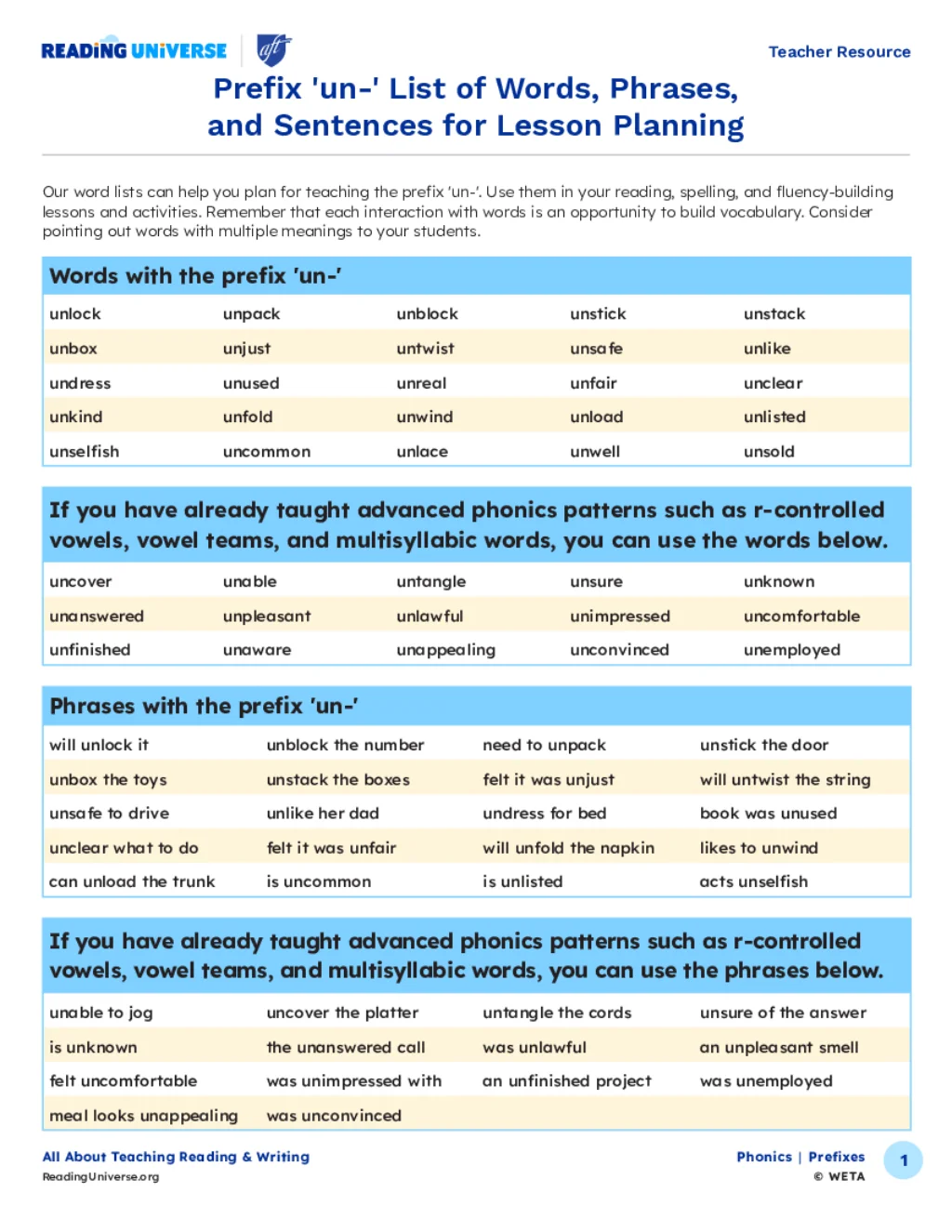 Our word lists can help you plan for teaching the prefix 'un-'. Use them in your reading, spelling, and fluency lessons and activities.